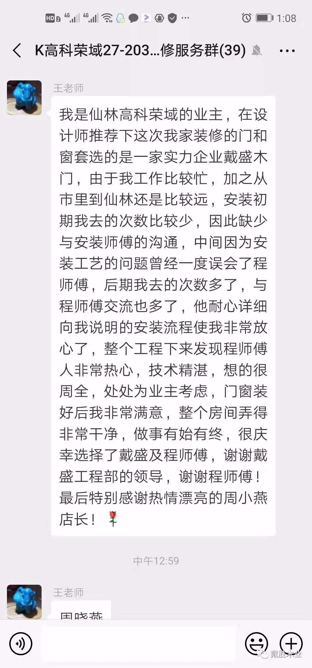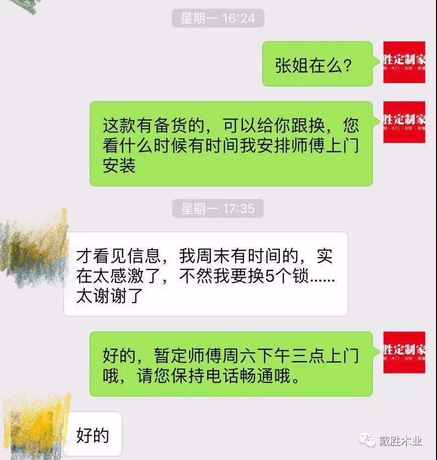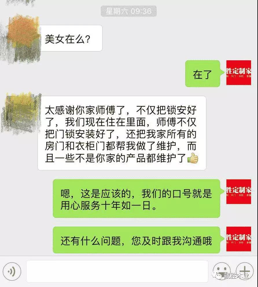 戴勝客服中心立刻安排“匠心服務(wù)團(tuán)”為客戶(hù)解決難題,不僅如此,更幫客戶(hù)把家中所有木門(mén)、柜門(mén)都進(jìn)行了維護(hù),得到客戶(hù)的高度評(píng)價(jià)。